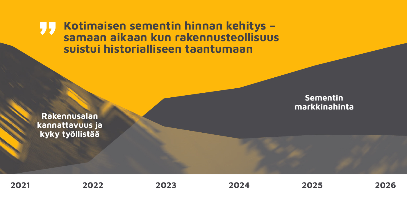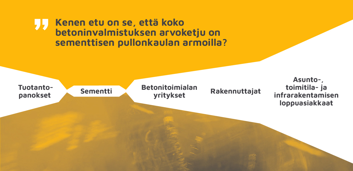 Vaikeat ajat eivät koske aivan kaikkia raaka-ainevalmistajia. Betonielementin valmistamiseen tarvittavien materiaalipanosten – sementin, teräksen, kiviaineksen ja veden – hintakehitys on ollut keskenään hyvin erilaista. Sementtitoimittajien kannattavuus on pysynyt huipputasolla, vaikka muilla rakentamisen arvoketjun yrityksillä on jo vuosia ollut hyvin hankala tilanne, josta on seurannut suuri määrä konkursseja, tehtaiden sulkemisia ja työttömyystilastoissa näkyviä sopeutuksia.