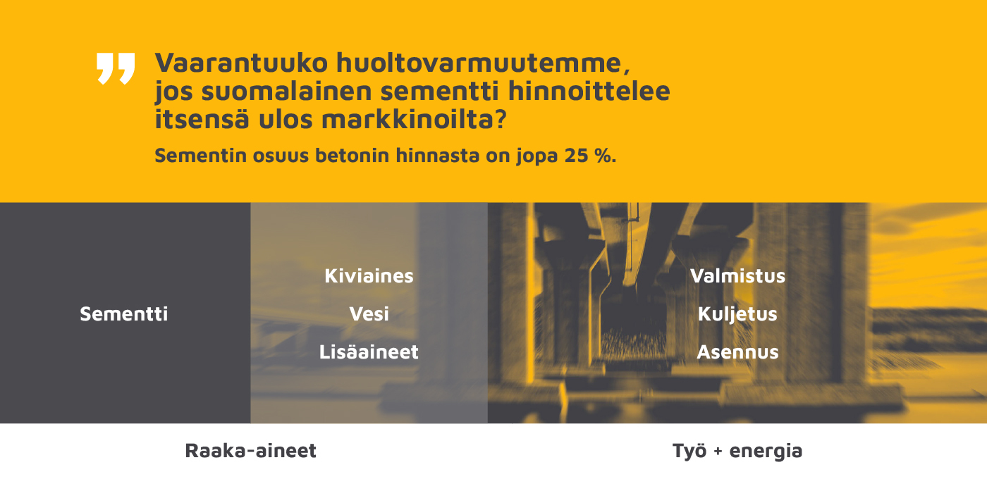 Suomessa on varsinaisesti vain yksi sementinvalmistaja. Maamme kriittiselle infralle on kertynyt viime vuosina runsaasti korjausvelkaa kiinni kurottavaksi ja koko Euroopassa ennustetaan lähivuosiksi merkittäviä investointeja turvallisuusinfraan. Liiallinen riippuvuus yksittäisistä toimittajista voi muodostua strategiseksi riskiksi esimerkiksi tilanteissa, joissa geopolitiikka aiheuttaa häiriöitä.